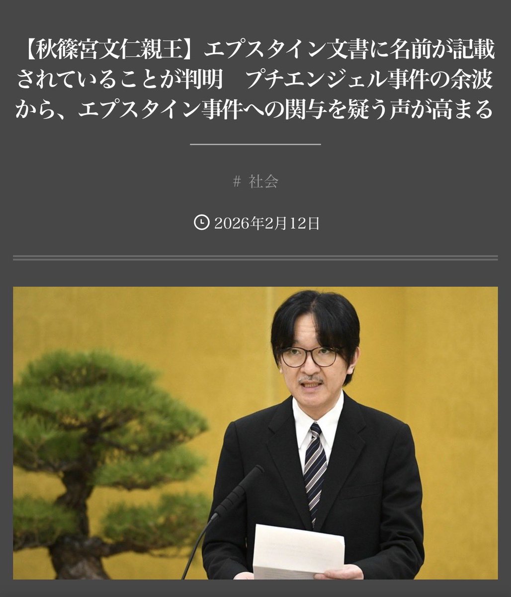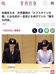 >しかし、日本の天皇の名を>リストに残すのはまずいだろうと削られたらしい。そうかねえ?調べたところじゃ、エプスタインって、そんな甘い男じゃなさそうだよ。自らのロり島に招待したセレブ客達の弱みを握って、それで、相手を脅してもいたという。(だから、大勢の人から、恨まれていたらしい。それが、エプスタインの不可解な死につながっている)ノルウェー皇太子妃ともメールのやり取りがあり、その写真を大事にとっておいたという、エプスタイン。ロイヤルの人間の弱みなら、大歓迎のはずだ。そんなエプスタインが、もし、徳仁の弱みを知ったら、トコトン、しゃ○り尽くすだろうよ。リストから、削るなんて、仏心を、おこすわけがない。いい加減な、情報操作を、また、やりたいんじゃないの?例のお方は。