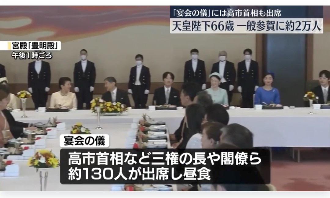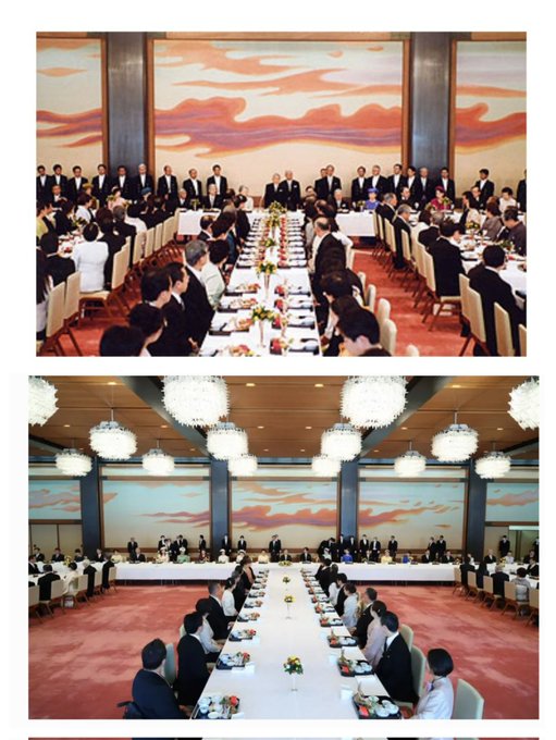 上:平成のころの天皇誕生日 宴会の儀下:令和の天皇誕生日 宴会の儀明らかに、招待客の数が減ってきている・・・