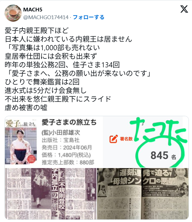 愛子さまの写真集は、1,000部も売れなかったんだね〜確か、愛子さまを天皇に、の署名も、900人前後しか、集まらなかった。そりゃ、山尾志桜里、○選するわな〜
